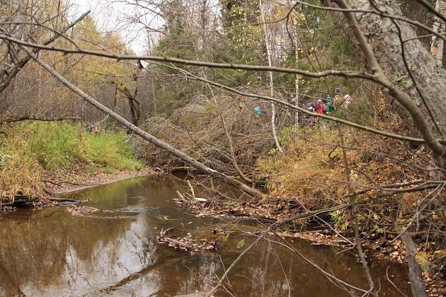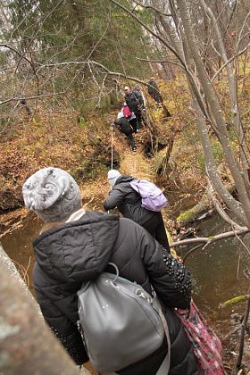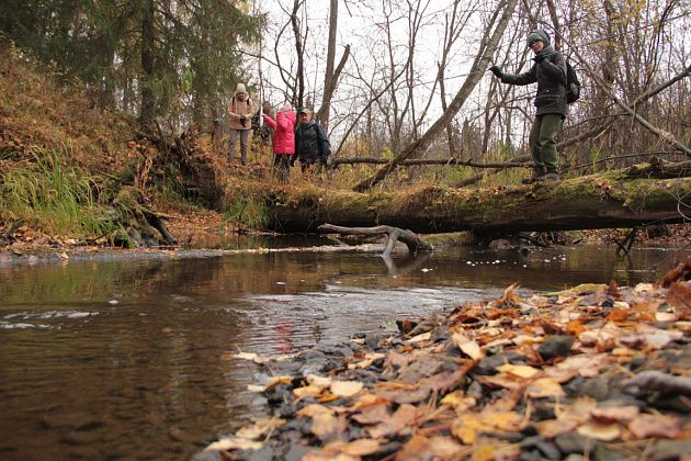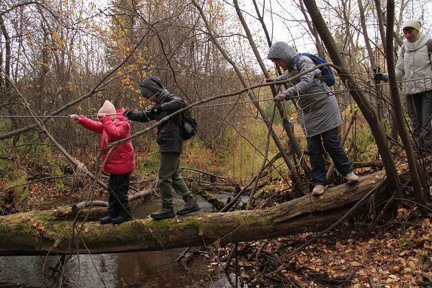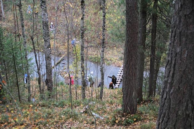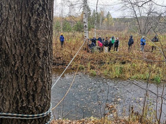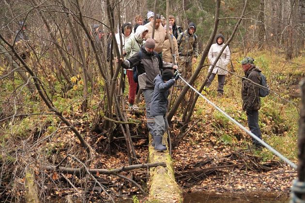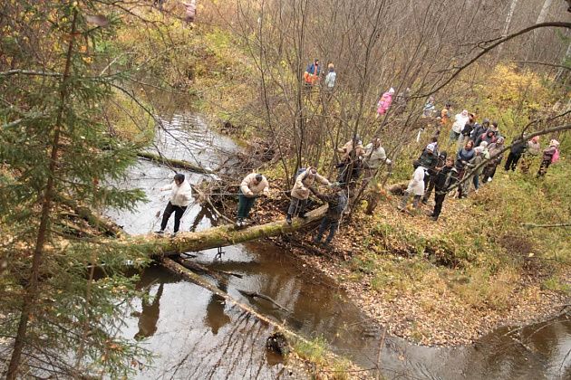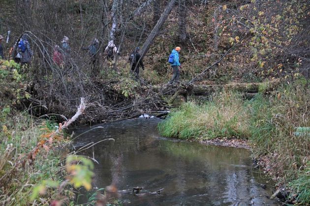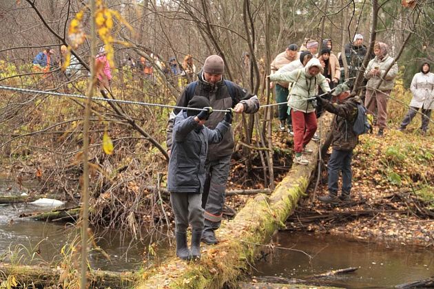 Первым испытанием для непривычным к походам по пересеченной местности стала переправа через реку Замарайку. Пройти нужно было по бревну. Здесь натянули веревку-перила. Для тех, кому этого не хватало, были длинные палки, которыми можно было опереться о дно реки.