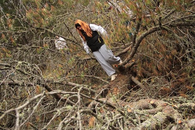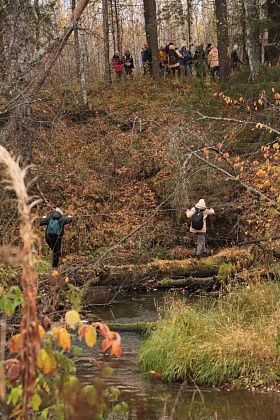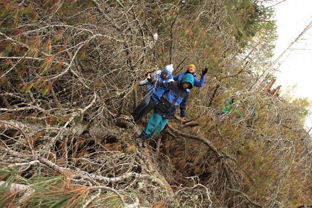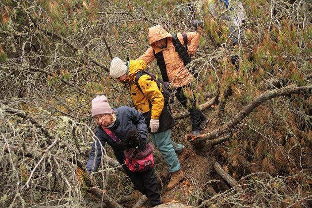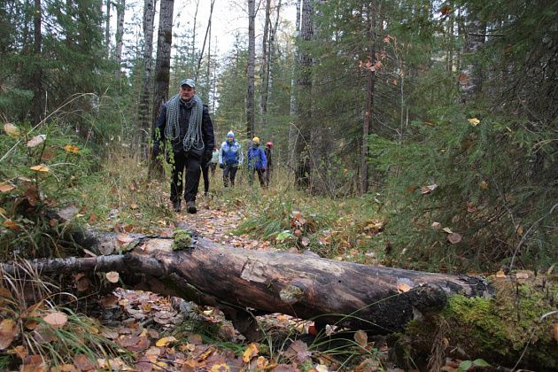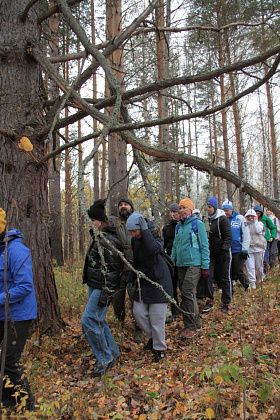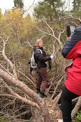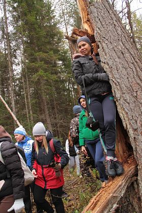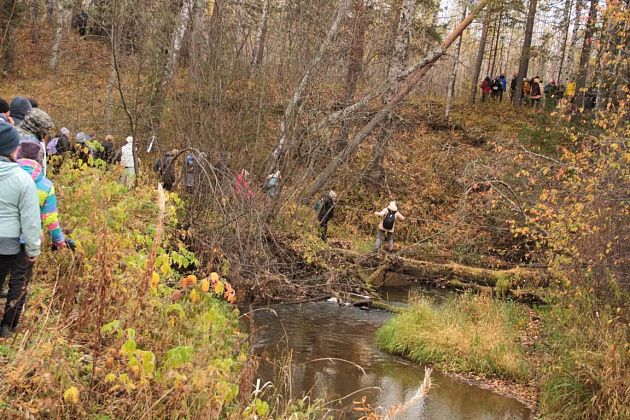 Андрей Беляев показал на земляную насыпь в этом месте и рассказал, что когда-то это было насыпной плотиной на пути реки. А через саму реку ведет ствол упавшего кедра внушительных размеров. В качестве опоры – ветви. Переправа занимает некоторое время, так как каждый хотел сфотографироваться, проходя по дереву. Недовольства ни у кого не было, людям было интересно.