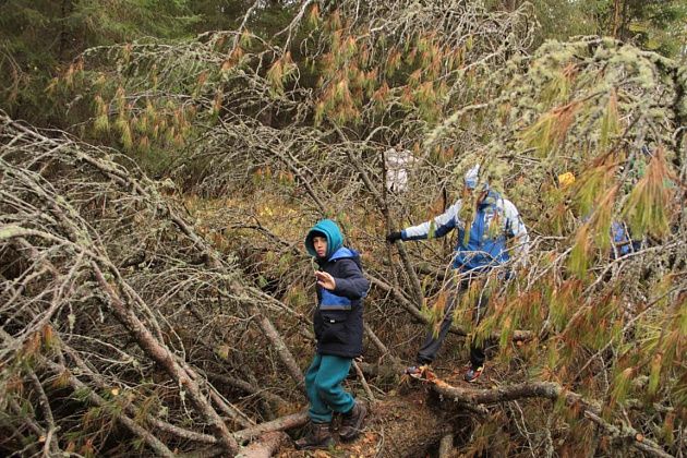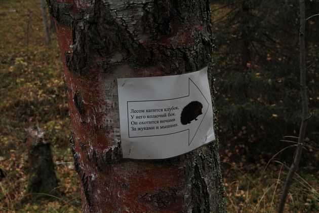 Для тех, кто выбрал дистанцию покороче, на развилках стояли специальные указатели со стрелками. А в лесу рядом с базами отдыха на деревьях то и дело можно было встретить небольшие аншлаги с текстом загадок про животных: «Лесом катится клубок, у него колючий бок. Он охотится ночами за жуками и мышами». И тут же подсказка в виде силуэта ежика.