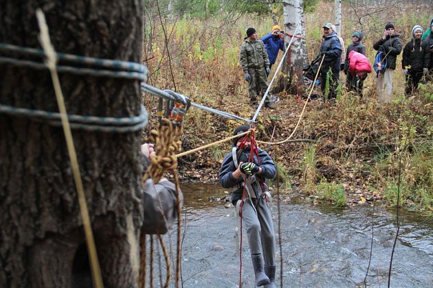 А вскоре извилистая тропинка привела к лагерю, где члены «Конжака» уже разожгли костры. На огне кипятился чай. Кто-то жарил сосиски, кто-то – мармелад, кто-то достал принесенные из дома бутерброды. Здесь же на реке сделали веревочную переправу. При помощи специального оборудования всем желающим показали, как переправиться через реку.