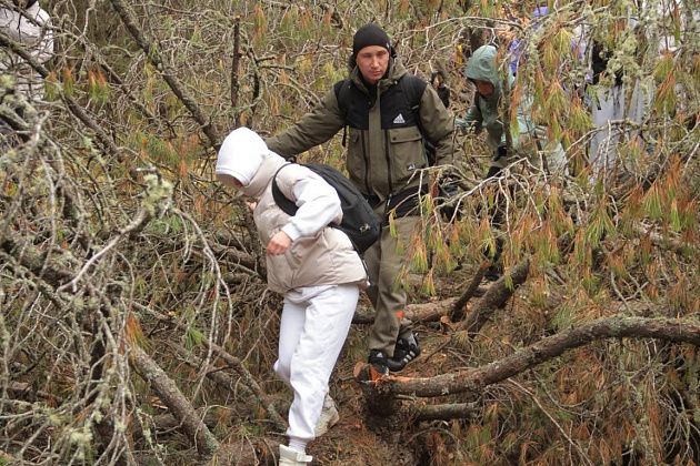 На последней развилке дорога направо уводила в лагерь, налево – на самый большой маршрут. Здесь оставшаяся, довольно внушительная группа сделала небольшую остановку. Люди достали термосы с горячими напитками, а организаторы в очередной раз предупредили, что тем, кто пойдет на большой маршрут, будет нелегко. Несмотря на это, этим путем пошли несколько десятков человек.