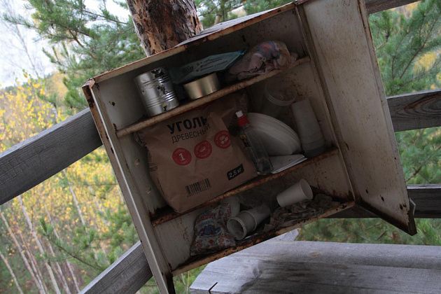 Недалек от старта, на склоне холма находится смотровая площадка — деревянное строение на бревенчатых сваях. Отсюда открывается вид на окрестные леса. Здесь же, в шкафчике, находится небольшой запас угля, одноразовой посуды, жидкость для розжига и даже соль.