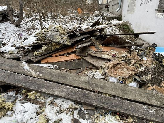 На углу дома валяется старый утеплитель, к этой куче уже кто-то подбрасывает мусор.