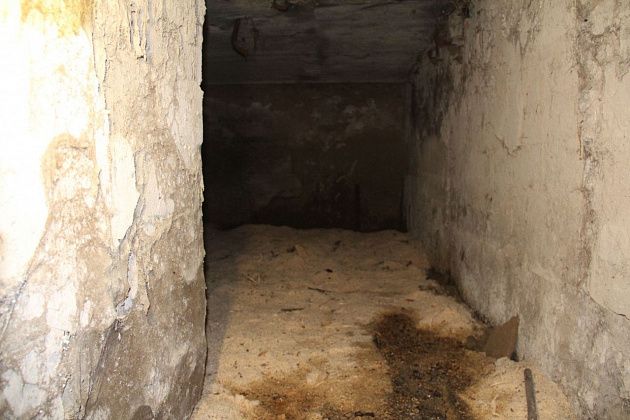Опил толстым слоем лежит в подвале, часть насыпанного пропиталась водой. На полу видны большие лужи. Где-то наверху раздался шум воды и из канализационной трубы полилась вода на пол.