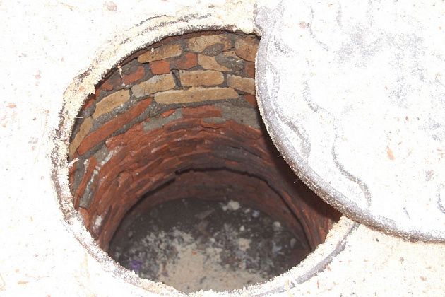 Рабочие вооружились ведром, один из них спустился в колодец.