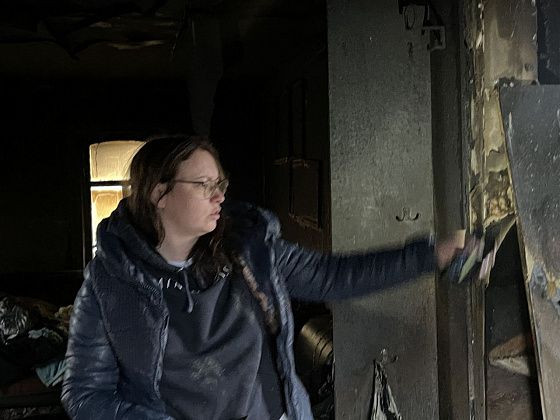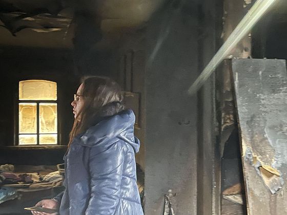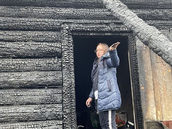 На следующее утро Елена с мужем Андреем осматривали последствия ночного пожара. Стоя в обгоревшем дверном проеме женщина показала, где что располагалось.
