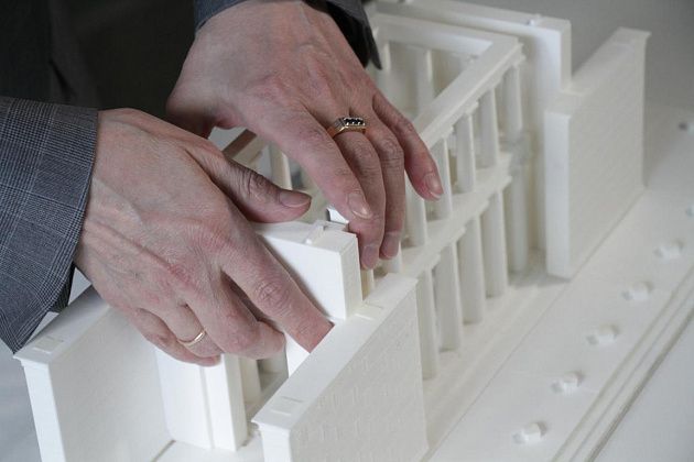 Тот самый макет – античный храм. Алексей Юрьевич принес его в библиотеку в большой коробке, в разобранном состоянии. Собирает самостоятельно в зале, где уже собирается публика.