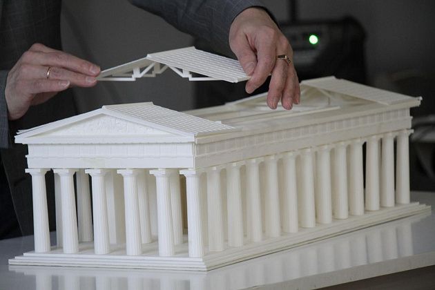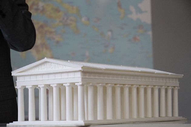 Модель храма не воспроизводит какую-то конкретную постройку. Это собирательный образ архитектуры. Но за его основу взят храм Геракла в Афинах.