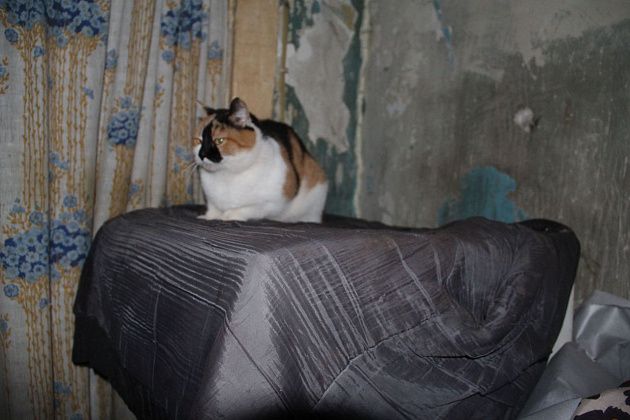 В сложившейся ситуации женщина пытается ухаживать за кошками, которые тут остались от разъехавшихся жильцов. Одна из них равнодушно сидит на холодильнике, вторая пугливо прячется на втором этаже.