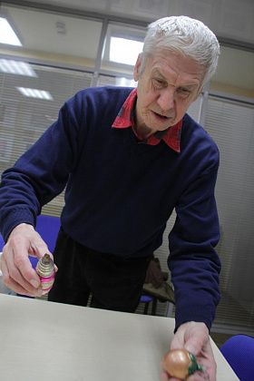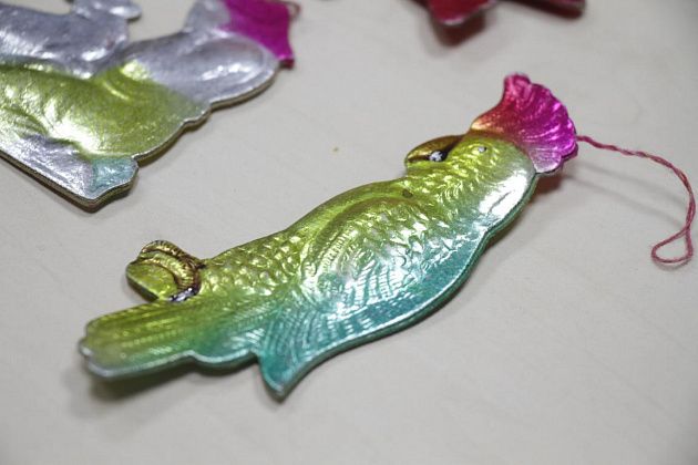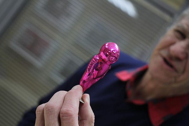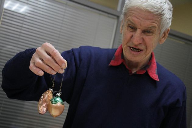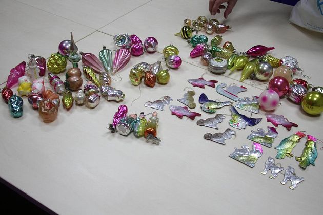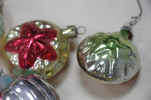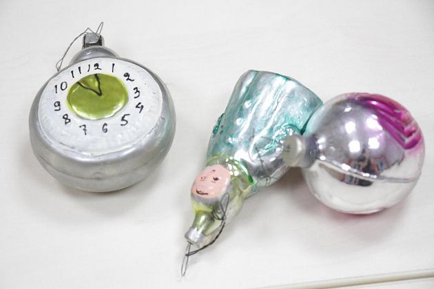 Фомичев продолжает извлекать из пакета игрушки 50-х годов. Их легко отличить от более поздних – при их изготовлении использовались немного другое стекло и краски.