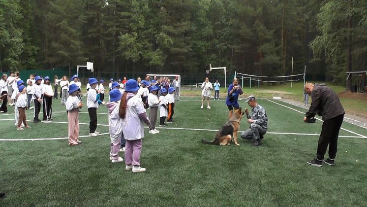 Предварила квест обширная программа. Под музыкальные ритмы «чайковцы» с гостями «зажгли» движениями разминки и собственно самой зарядки стадион лагеря. Все, как один, повторяли современный движ лидеров спортивных площадок. Подхватила отличное настроение и ритмы фристайла служебная собака по кличке «Царина» с кинологом
