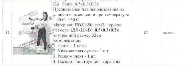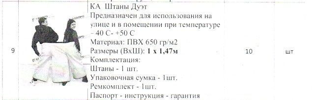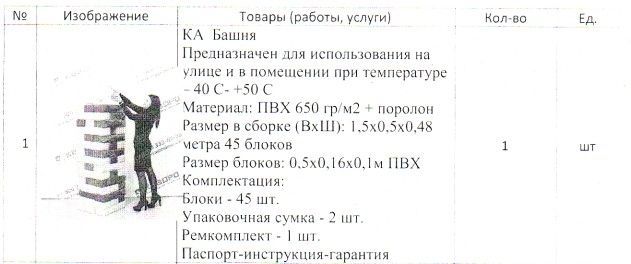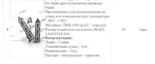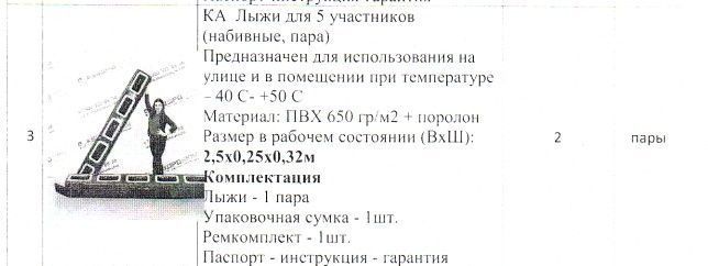 Согласно техническому заданию, приобретается 10 позиций: башня (известна также как огромная Дженга), две пары лыж на 5 участников, 14 пар лыж на 3 участника, 13 наборов для метания блинов (2 тарелки и 10 блинов в каждом), 8 водоносов «Хохлома Премиум», городки, 10 гусениц «Эконом» (8-метровая замкнутая лента, в которой могут поместиться 5 человек), 10 штанов «Дуэт», солнцеворот (пластиковая палка с солнышком и 12 лент), 10 пар лаптей.