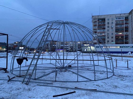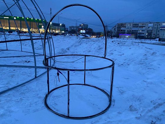 Днем 22 декабря на кольцевой развязке начался монтаж световой инсталляции. По словам рабочих, которые монтировали металлическую конструкцию, на пересечении улиц Ленина и Пржевальского появится гигантский "елочный шар".