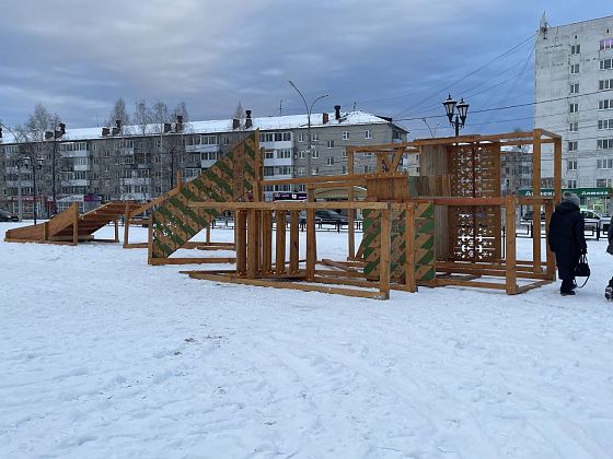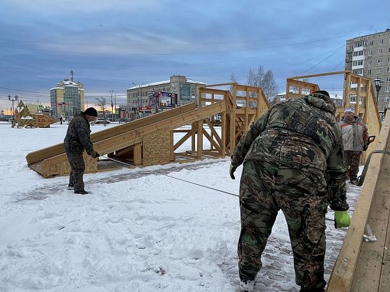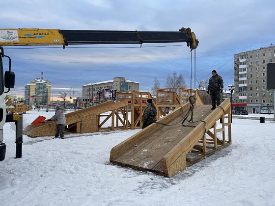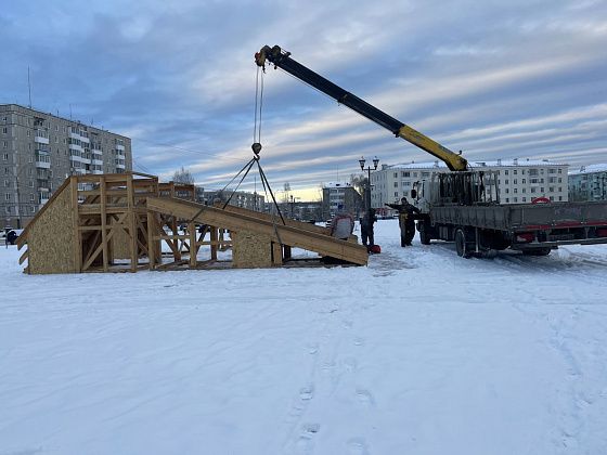 Работы на площади начались за полтора месяца до окончания оговоренного срока, 13 ноября. В этот день по краям площади стояли привезенные элементы деревянных горок. Две из них рабочие устанавливали на места с помощью манипулятора.