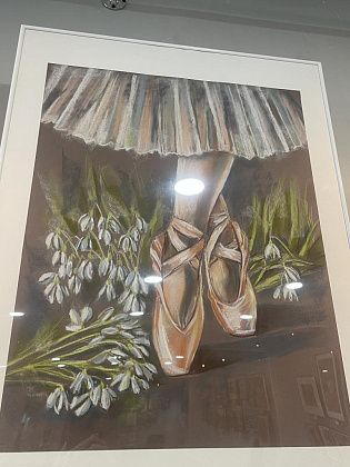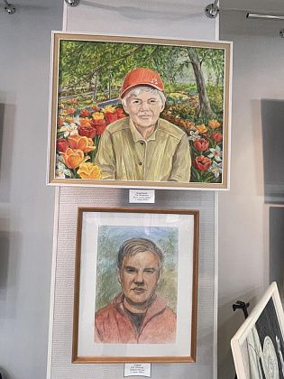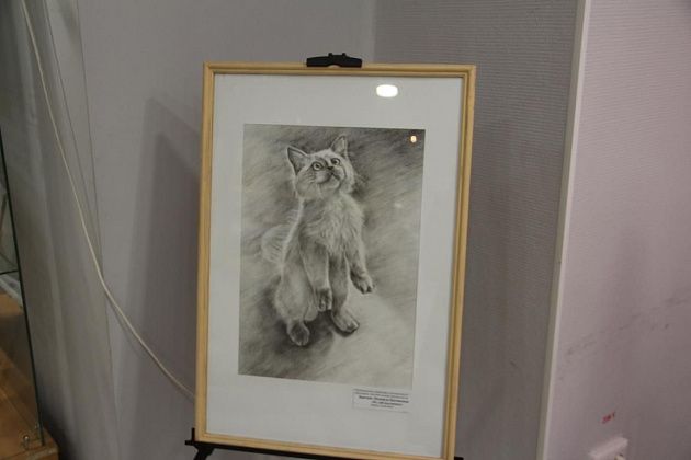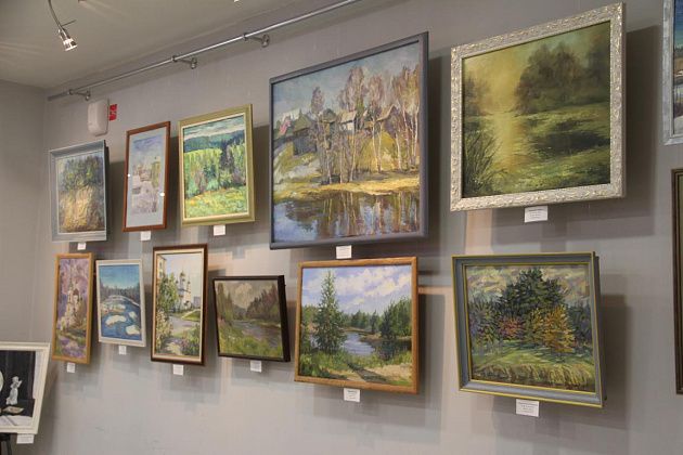Картины расположены в витринах, на стенах, на мольбертах. Работы выполнены в разных техниках. Кто-то писал картины маслом, кто-то - карандашом.