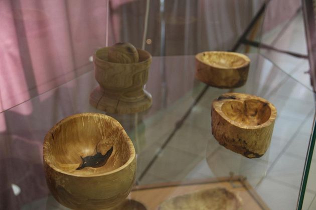 В стеклянных витринах представлены работы из дерева Петра Иванова.