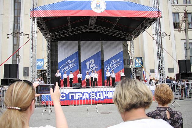 Праздник открыл танец юных серовчан с воздушными флагами и флагами в руках под песню «Команда мечты – Россия – страна возможностей». На площади было развернуто огромное полотнище триколора и вокалисты исполнили гимн России.