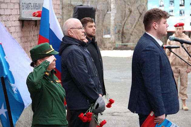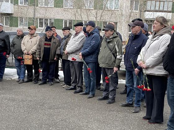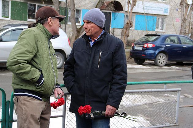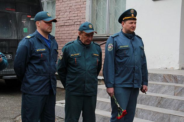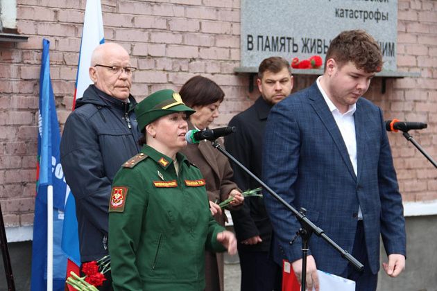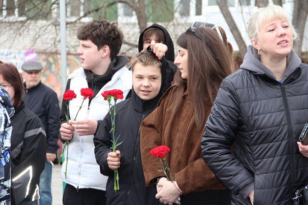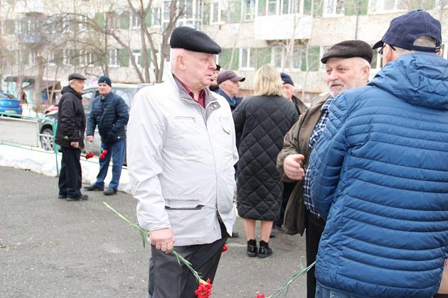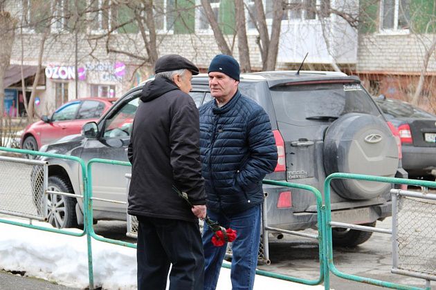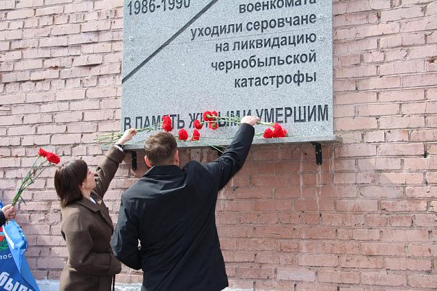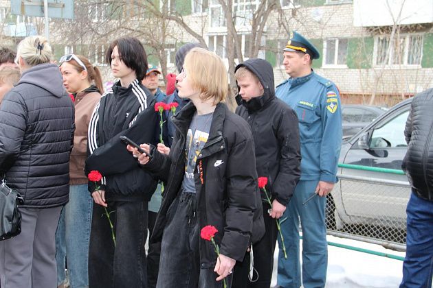 У военкомата собрались ликвидаторы последствий аварии, их родные, огнеборцы 56-й пожарно-спасательной части, подростки, юнармейцы. В руках люди держали красные гвоздики. Часть из них была обмотана траурными лентами.