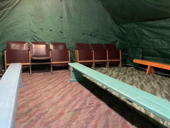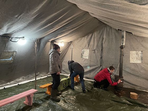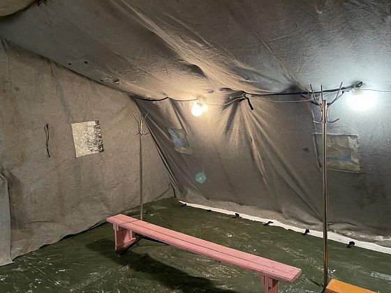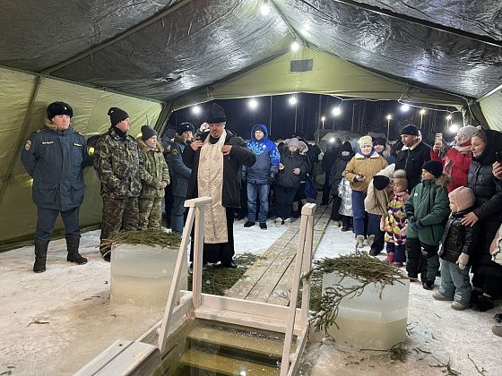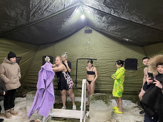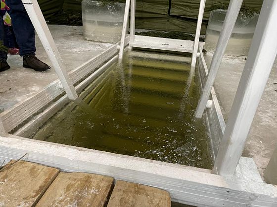 На берегу водохранилища установили две палатки, где люди переодевались перед окунанием в воду. Сотрудники ГИМС рассказали, что это сделано в целях безопасности, чтобы не нагружать лед. Тепло в мужской палатке поддерживала печь, в женской - тепловентилятор. Женщины сетовали - порой вентилятор отключался и переодеваться было прохладно. Саму купель оборудовали метрах в 20 от берега. Ее, как и в прошлые годы сделали закрытой, с деревянным коробом внутри.