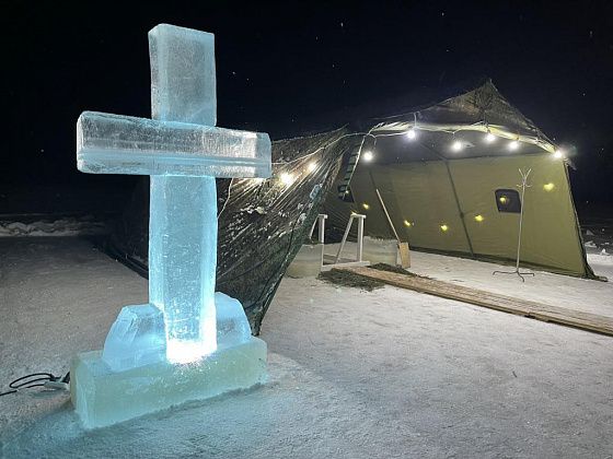 От ветра прорубь защищала палатка. На воде появлялся тонкий лед, его лопатами убирали сотрудники МЧС. От купели в сторону палаток тянулся дощатый настил, по мнению людей, его надо было устлать лапником, чтобы ноги не примерзали к доскам. Рядом с купелью возвышался крест изо льда.