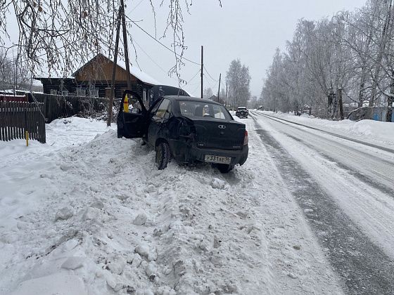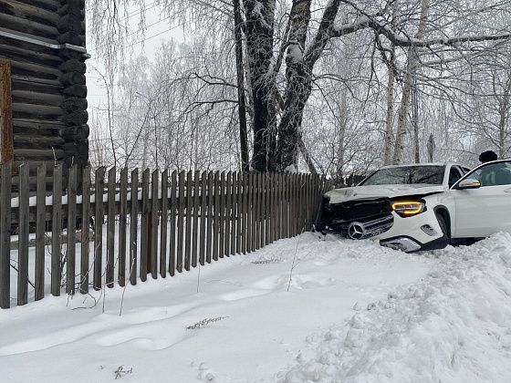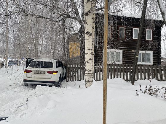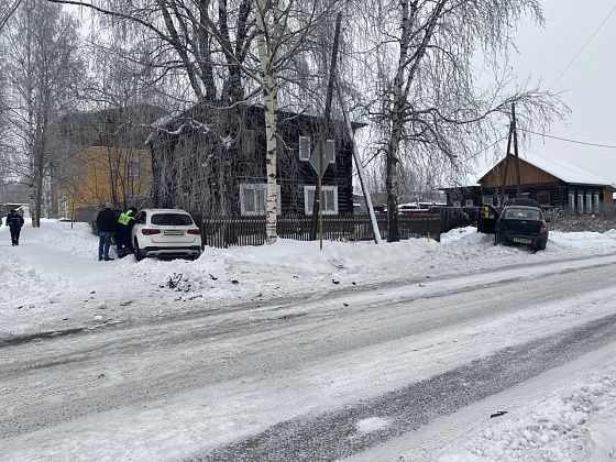 Днем на месте ДТП работали сотрудники ГИБДД. На перекрестке валялись разбитые пластиковые части от машин. Автомобиль LADA Granta стоял в сугробе, с открытым капотом. На левой боковой стороне машине видны царапины. Mercedes находился в сугробе. Через тротуар автомобиль доехал до палисадника дома. Видимо, от удара, в салоне сработали подушки безопасности. Видны значительные повреждения в передней части автомобиля.